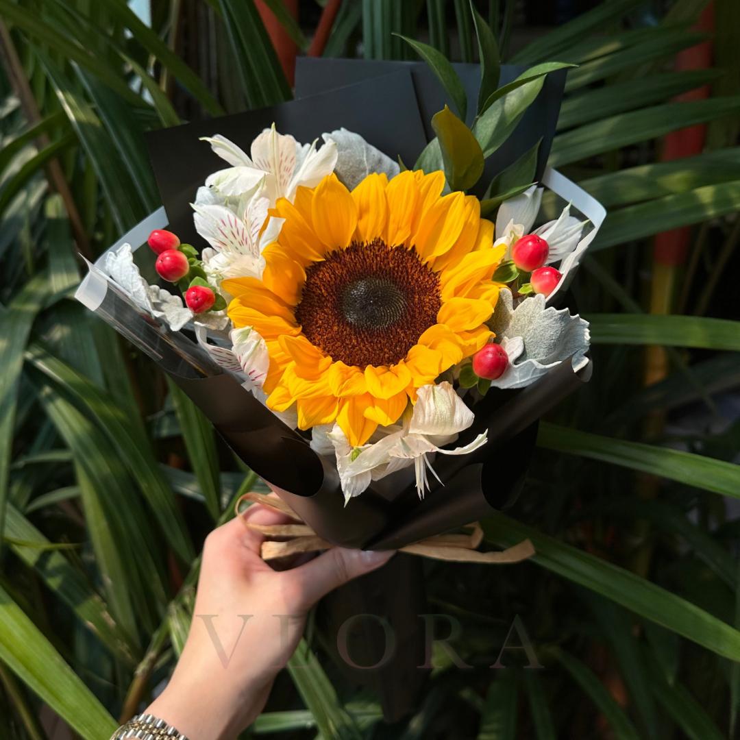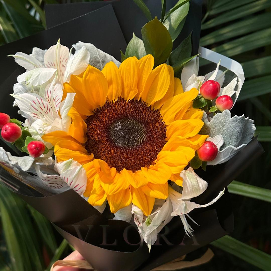 Featuring one vibrant Sunflower, the bouquet is complemented by Hypericum Red, White Alstroemeria, Dusty Miller, and Ruscus, creating a balanced mix of color, softness, and greenery. Wrapped in black and white paper, the arrangement delivers a contemporary look that stands out with effortless style.