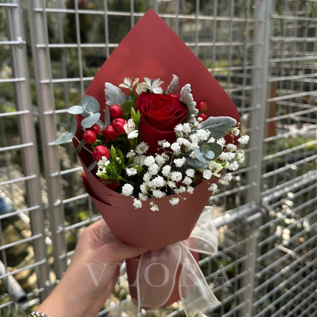 A single red Rose takes center stage, surrounded by delicate Baby’s Breath, rich red Hypericum, and layers of Eucalyptus, Dusty Miller, and Verbena. Wrapped in luminous rose gold red, this arrangement is understated yet expressive — a modern take on romance with depth, softness, and intention.