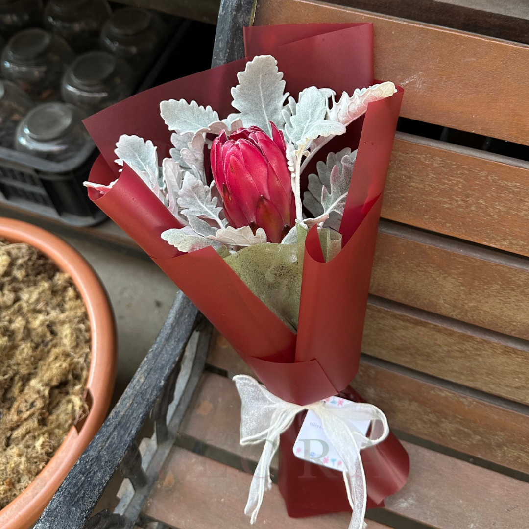 A striking single Protea with silvery Dusty Miller, wrapped in bold red for a statement of strength and beauty.