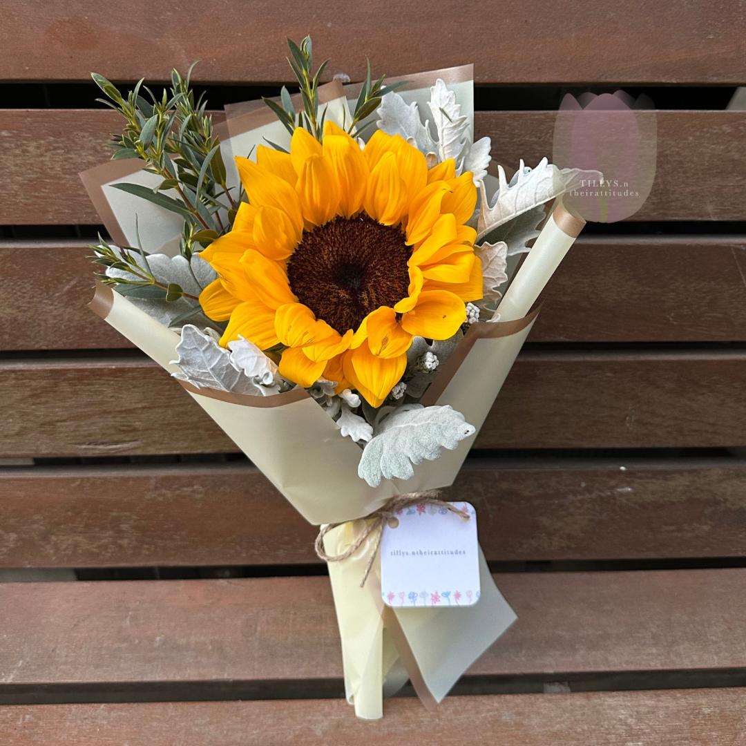 🌻 A single radiant Sunflower stands tall as the star of this bouquet, symbolising warmth, joy, and positivity. Accented with soft Dusty Miller, lush South African greens, and the fresh scent of Eucalyptus, it’s a cheerful blend of texture and colour. Wrapped in vibrant yellow, this bouquet shines with brightness — a perfect pick-me-up or a sunny way to send love and encouragement.