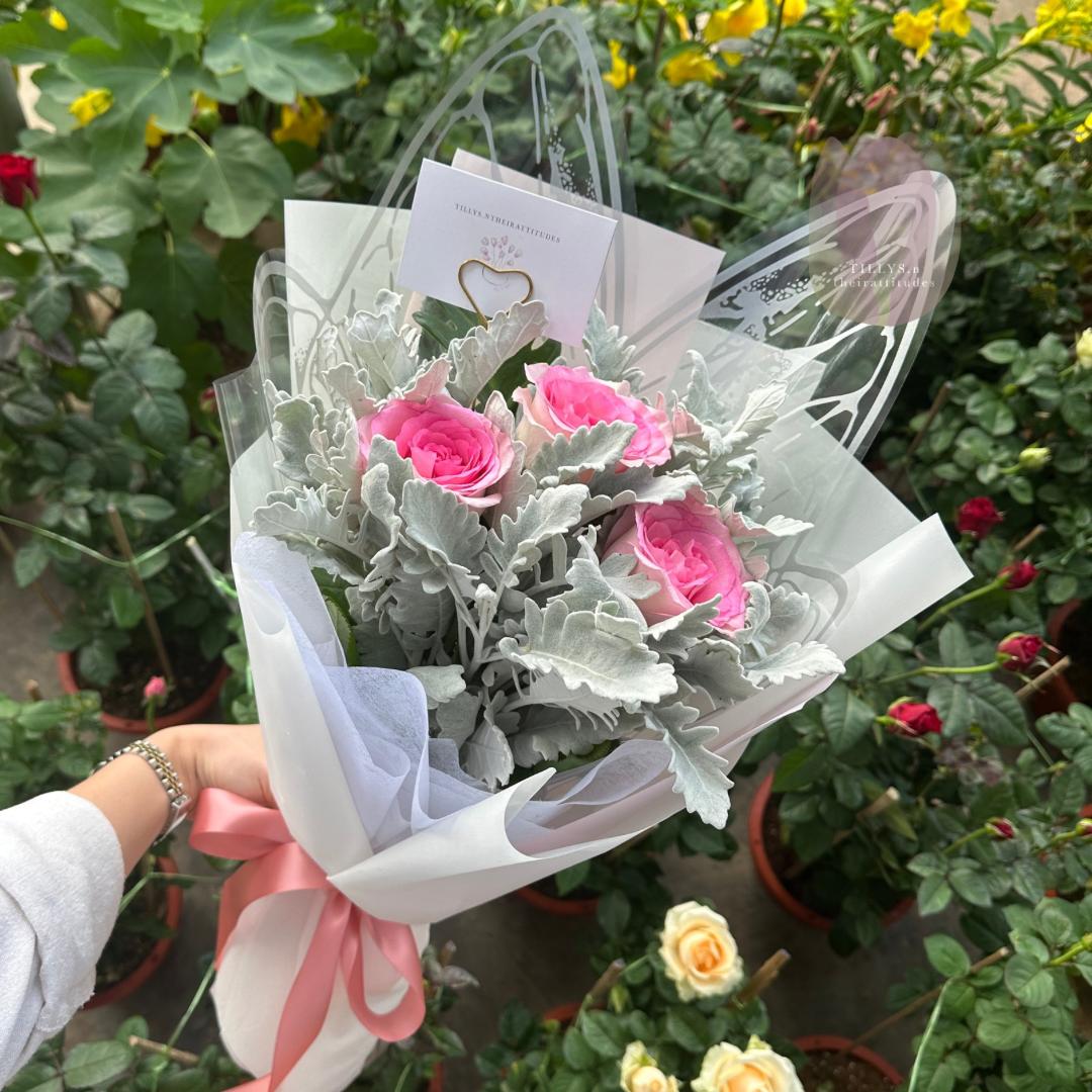 Three delicate pink Roses take the spotlight in this graceful bouquet, symbolising admiration and heartfelt affection. Paired with soft Dusty Miller for a silvery touch, the arrangement is wrapped with shimmering silver butterfly wings and white, then finished with a charming pink bow. Elegant and romantic, it’s the perfect gift to express love, gratitude, or simply to brighten someone’s day.