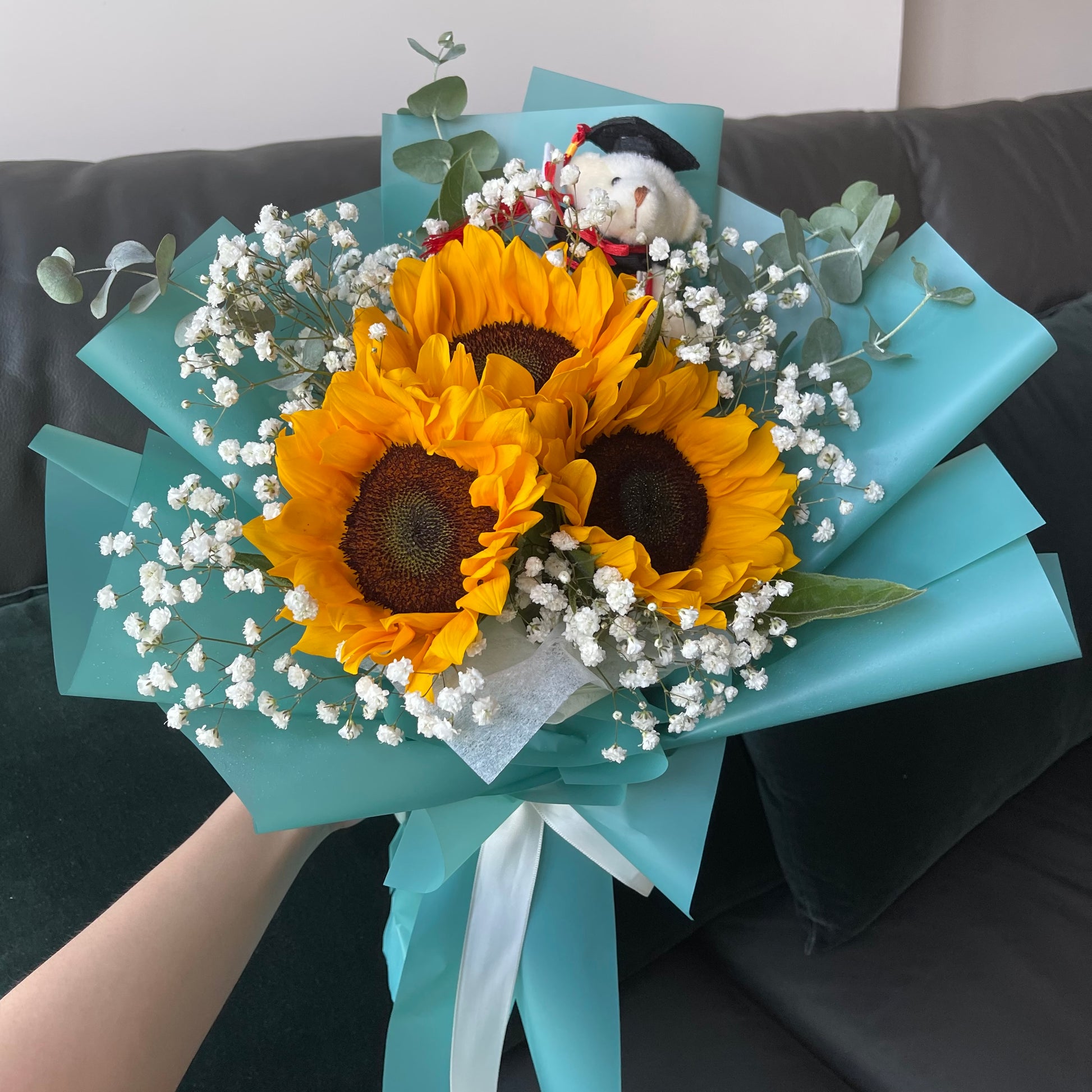 A joyful flower bouquet featuring three vibrant Sunflowers, symbolising success and happiness, paired with delicate Baby’s Breath and a cute Graduation Bear. The perfect gift to celebrate a new beginning! 🎓✨