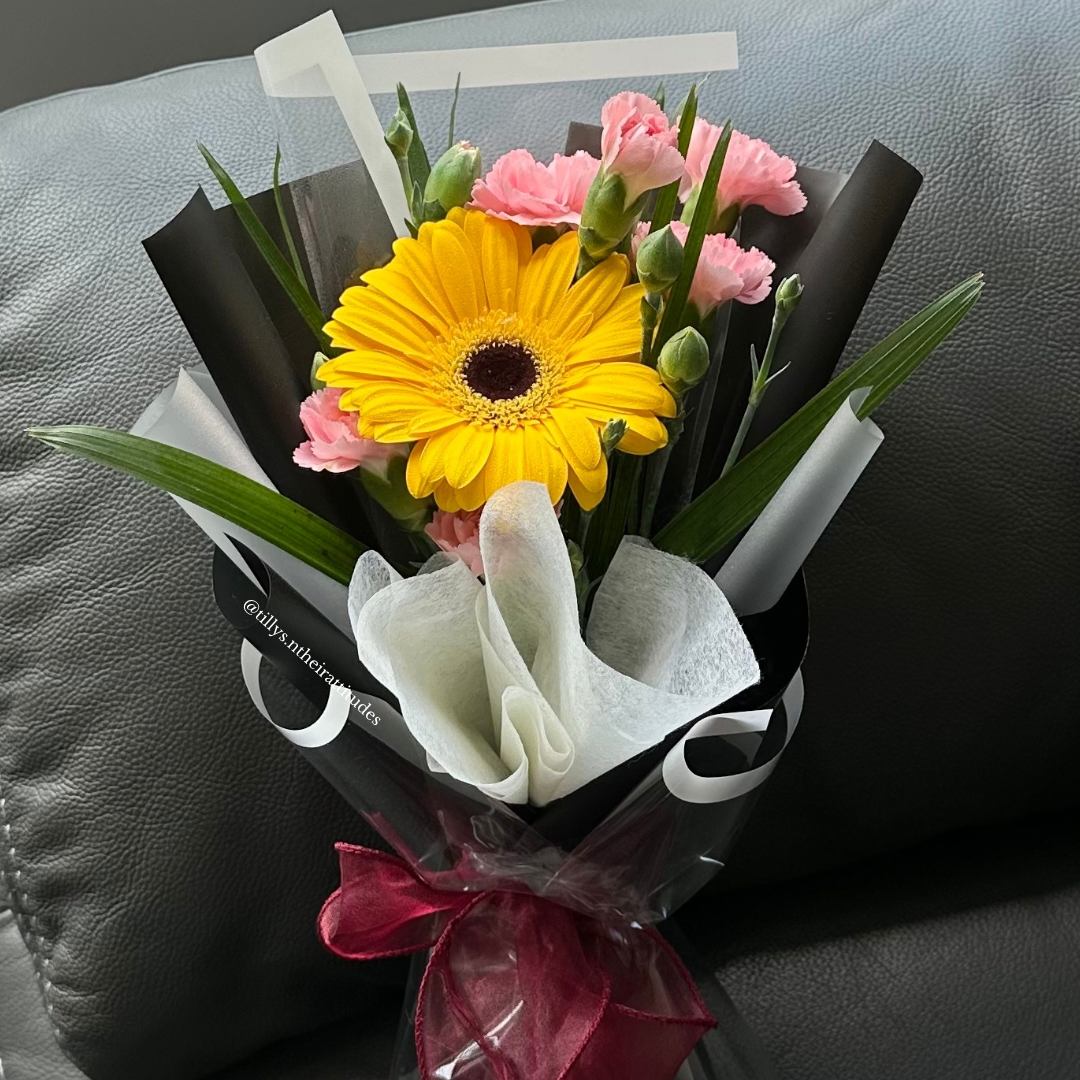 Celebrate success with a vibrant yellow Gerbera symbolising joy and achievement, paired with delicate pink Carnations for a touch of admiration. Wrapped in classic black and white, this bouquet exudes elegance and pride, perfect for graduations! 🎓🌼💖🖤🤍
