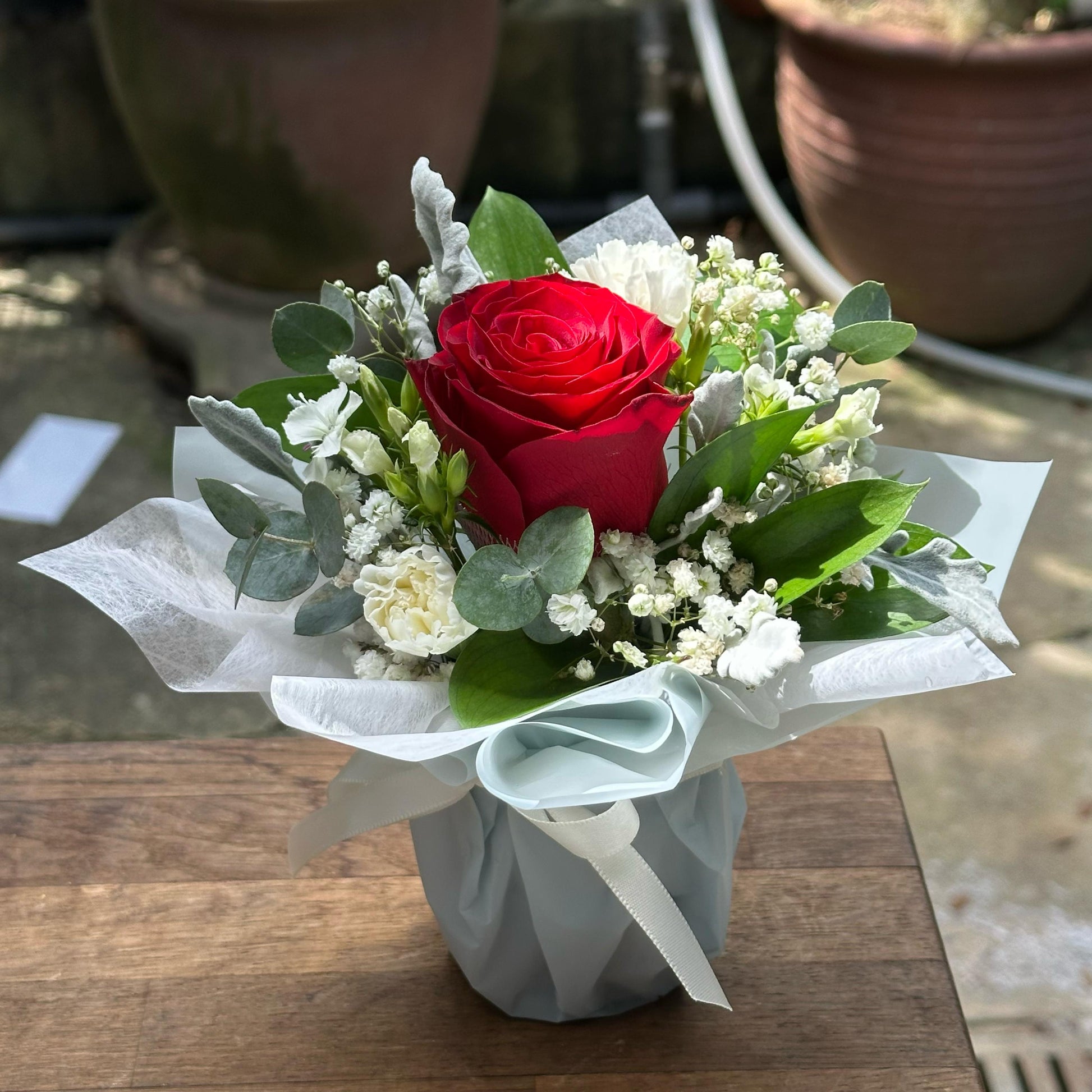 A refined table arrangement featuring a single red Rose, thoughtfully paired with Eucalyptus, Baby's Breath, Verbena, Ruscus, Dusty Miller, and a soft White Carnation. Wrapped in delicate baby blue, this piece brings a calm, romantic presence to any table — subtle, balanced, and beautifully intentional.