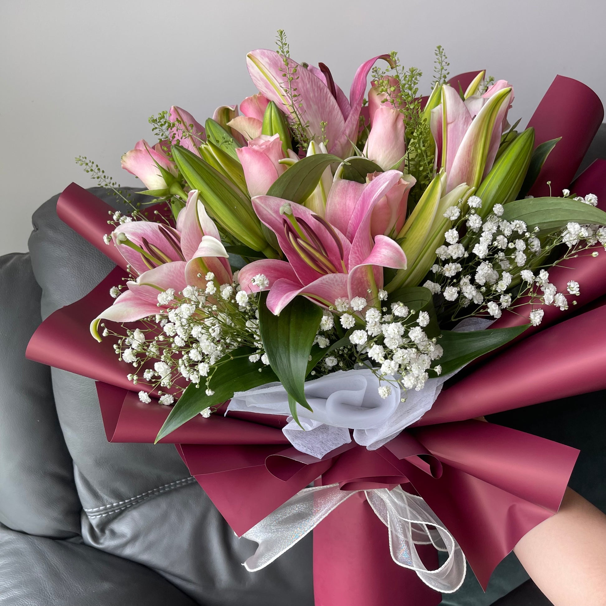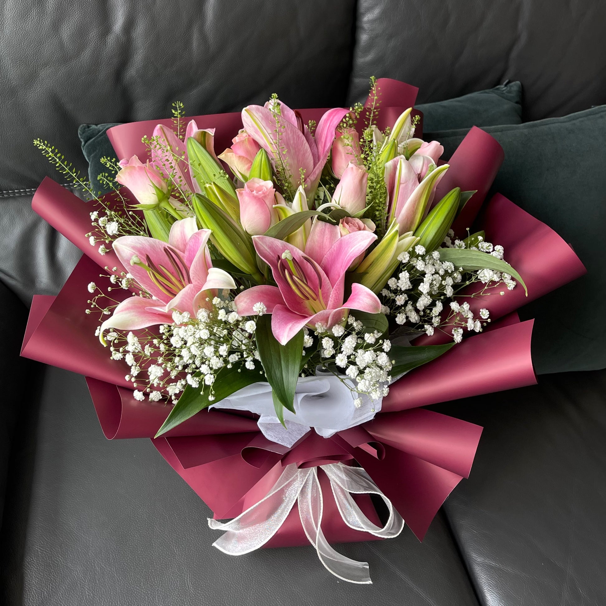 A graceful mix of pink Roses, Lilies, and Baby’s Breath, wrapped in bold red for a bouquet that speaks of love, elegance, and energy.