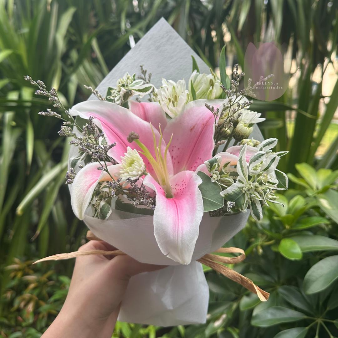A single bloomed Lily takes the spotlight in this charming mini bouquet, paired with assorted fillers that may vary to keep each bouquet unique. Wrapped consistently for a clean, elegant look, it’s a petite yet thoughtful arrangement — perfect as a delicate gift or a small gesture of appreciation.