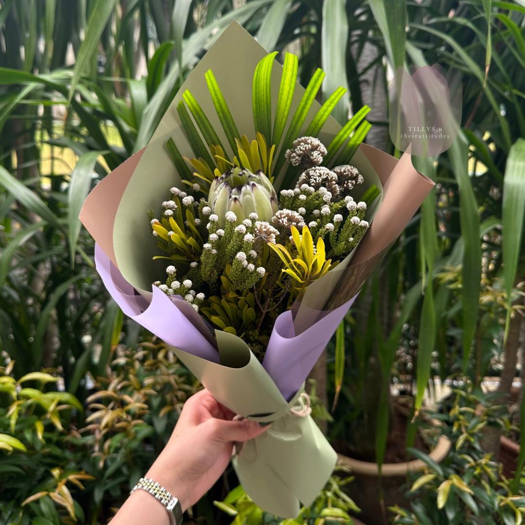 The Protea symbolises courage, transformation, and resilience — a powerful flower for moments when you want to send strength, admiration, or encouragement to someone special. Its dramatic presence makes this bouquet a meaningful and memorable gift.