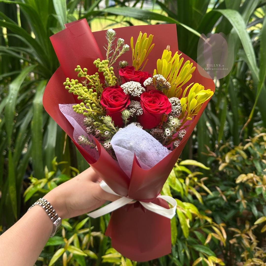 Three classic red Roses come together in this elegant bouquet, paired with lush South African greens and wrapped in vibrant red. Symbolising love, passion, and admiration, this timeless arrangement is perfect for expressing heartfelt emotions — from romantic gestures to special celebrations.