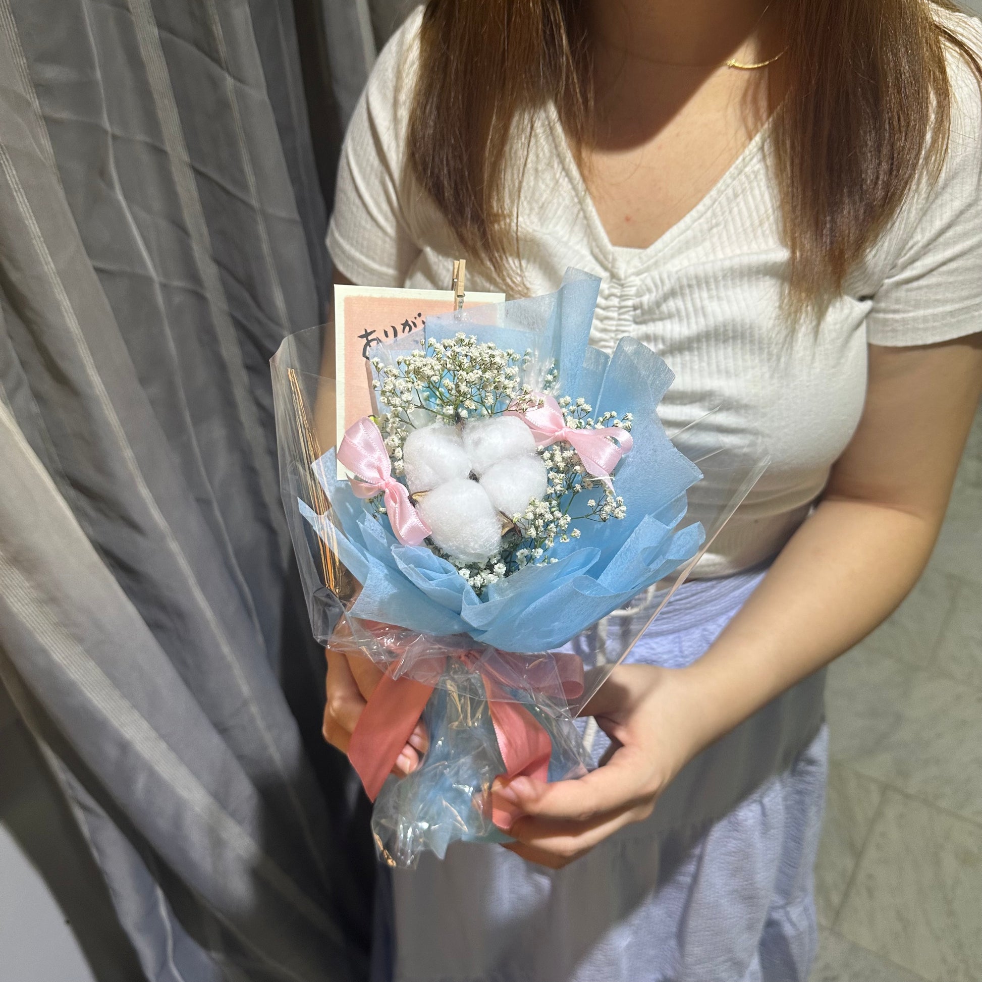 A single stalk of soft puffy Cotton Flower, beautifully paired with fresh White Baby's Breath and adorned with Bows in your choice of color.