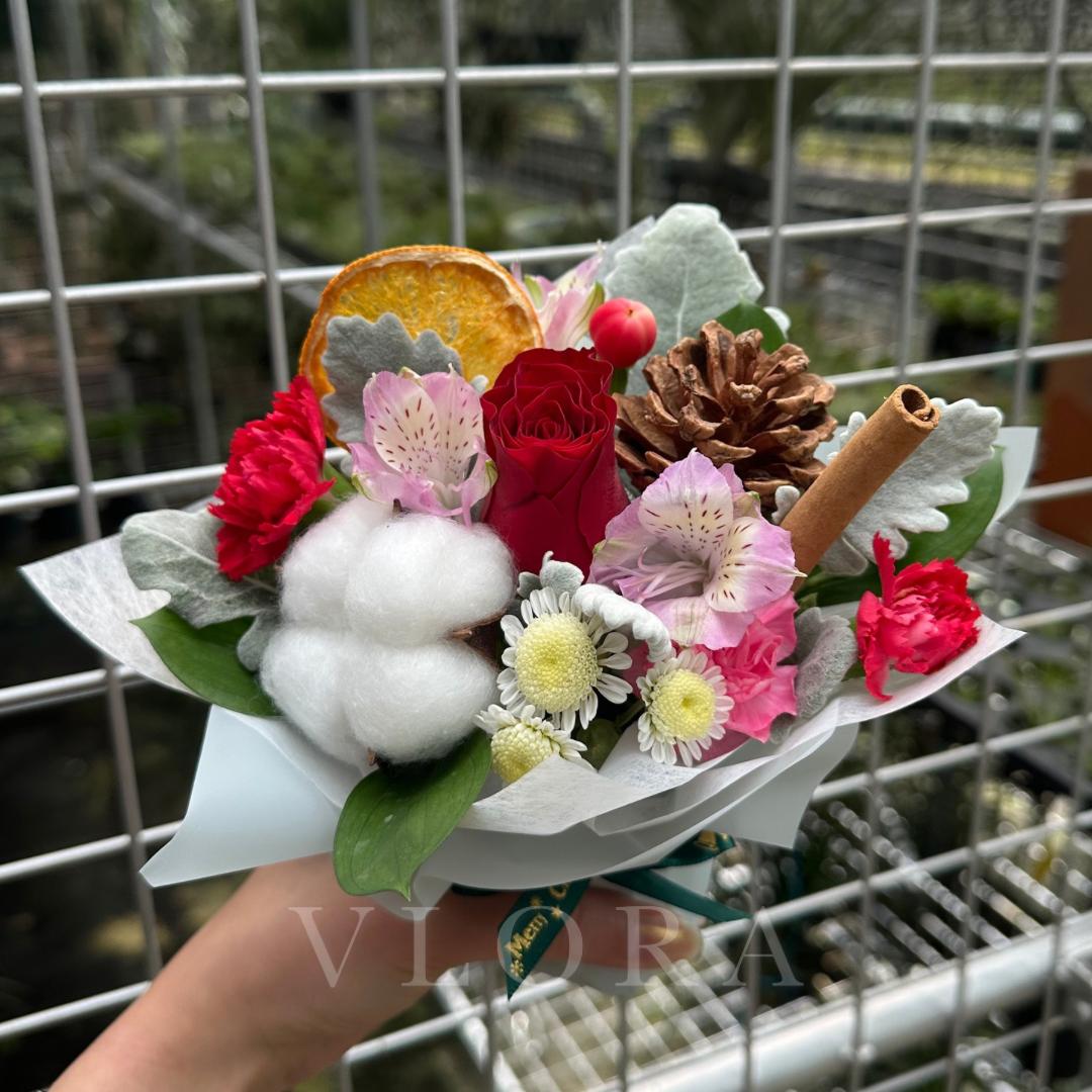Featuring a thoughtful mix of fresh blooms and seasonal accents, this arrangement includes a Red Rose, lilac Alstroemeria, and red Carnation, complemented by Dusty Miller, Ruscus, and red Hypericum berries. Festive details such as a Cotton flower, Pine cone, dried lemon slice, and cinnamon stick add natural texture, subtle fragrance, and Christmas charm.