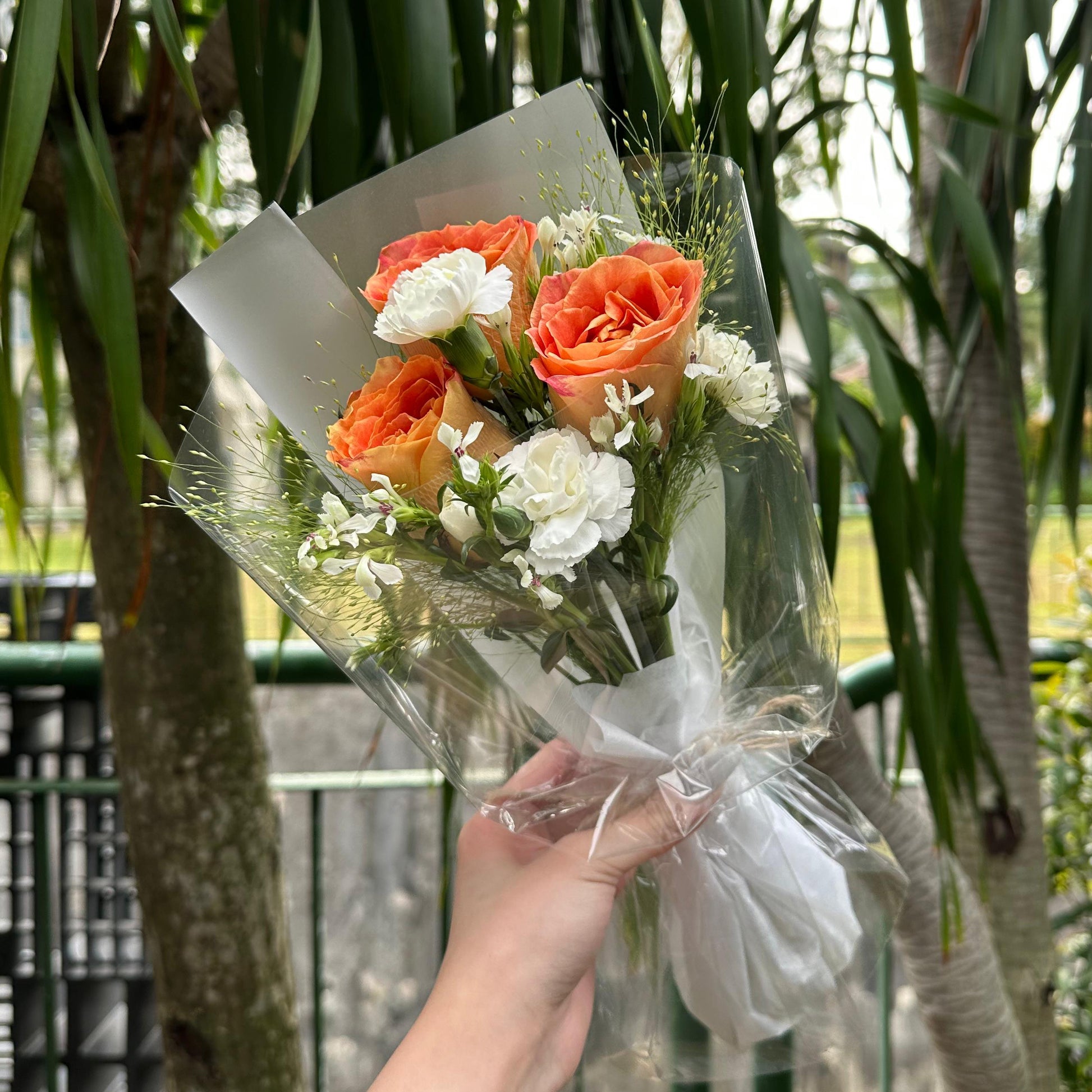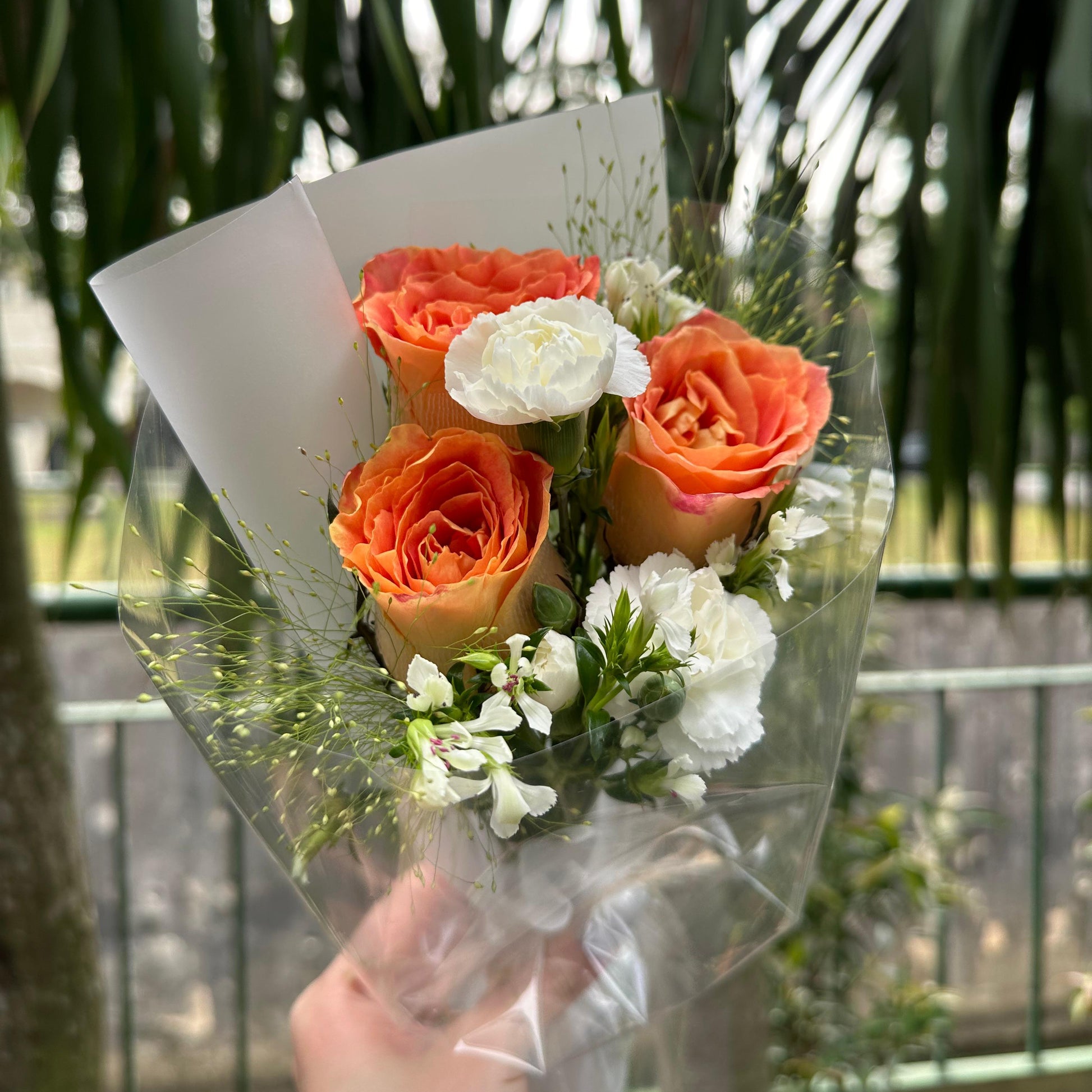 Vibrant, cheerful, and elegantly simple, this fresh flower bouquet features three Orange Roses paired with soft White Carnations and delicate Verbena, creating a balanced and uplifting arrangement.