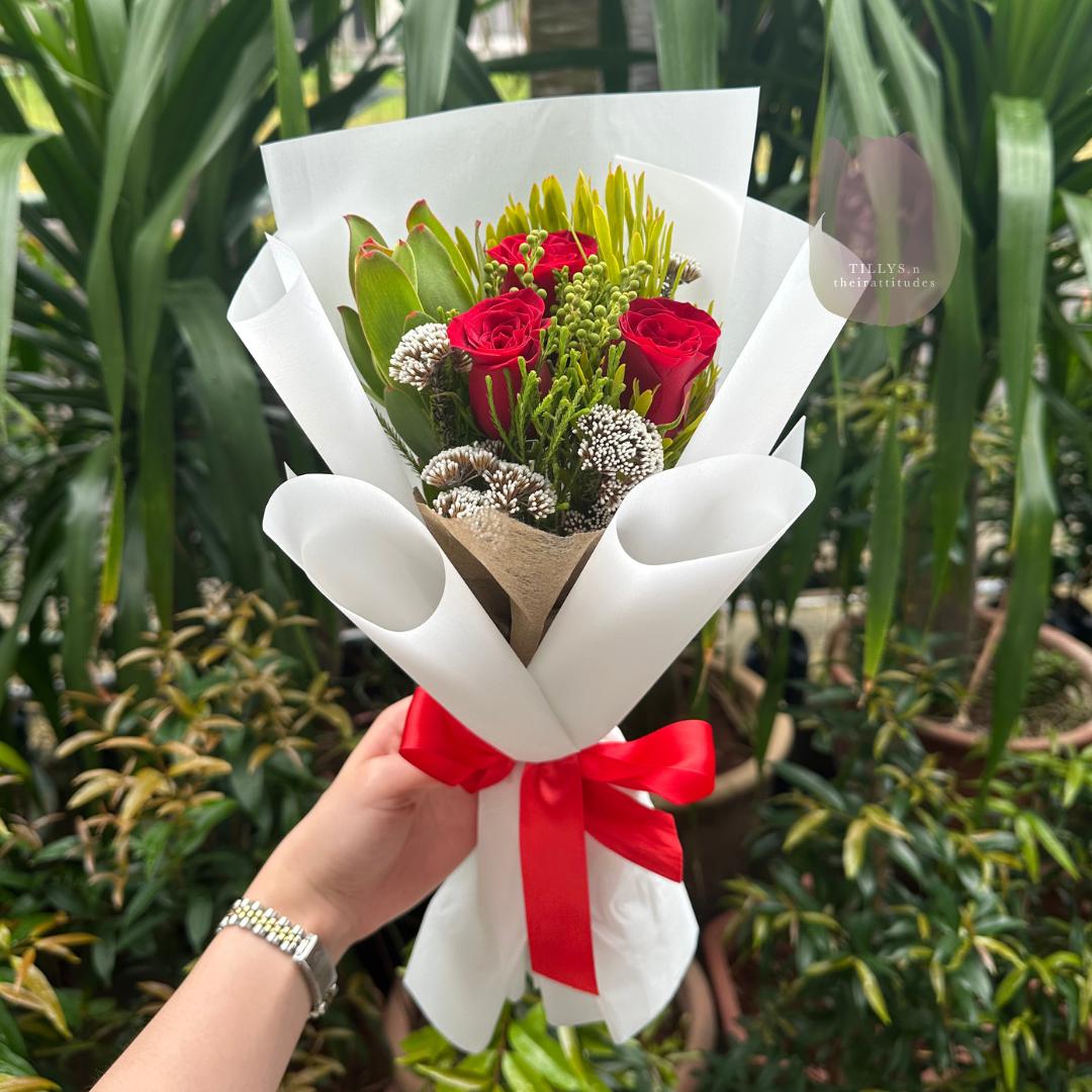 Three classic red Roses come together in this elegant bouquet, paired with lush South African greens and wrapped in vibrant white. Symbolising love, passion, and admiration, this timeless arrangement is perfect for expressing heartfelt emotions — from romantic gestures to special celebrations.
