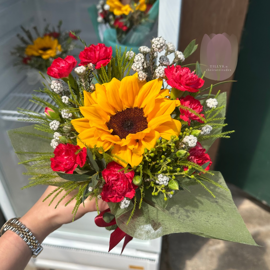 A cheerful Sunflower takes center stage in this petite table arrangement, accompanied by vivid red Carnation sprays and textured South African greens. Bright yet balanced, it brings a splash of sunshine and earthy charm to any tabletop, desk, or small corner. A compact beauty that radiates warmth, passion, and a touch of the wild.