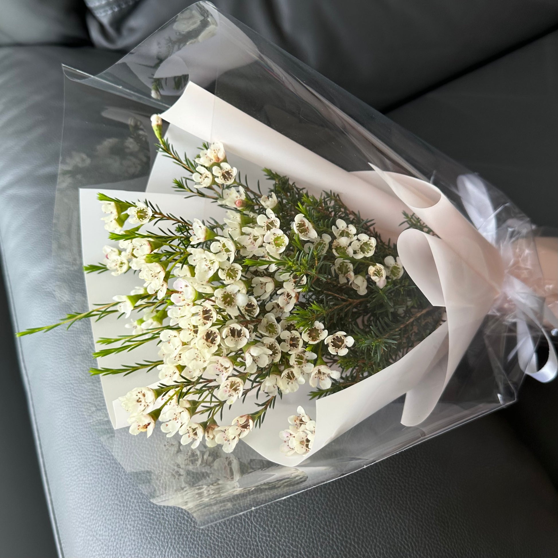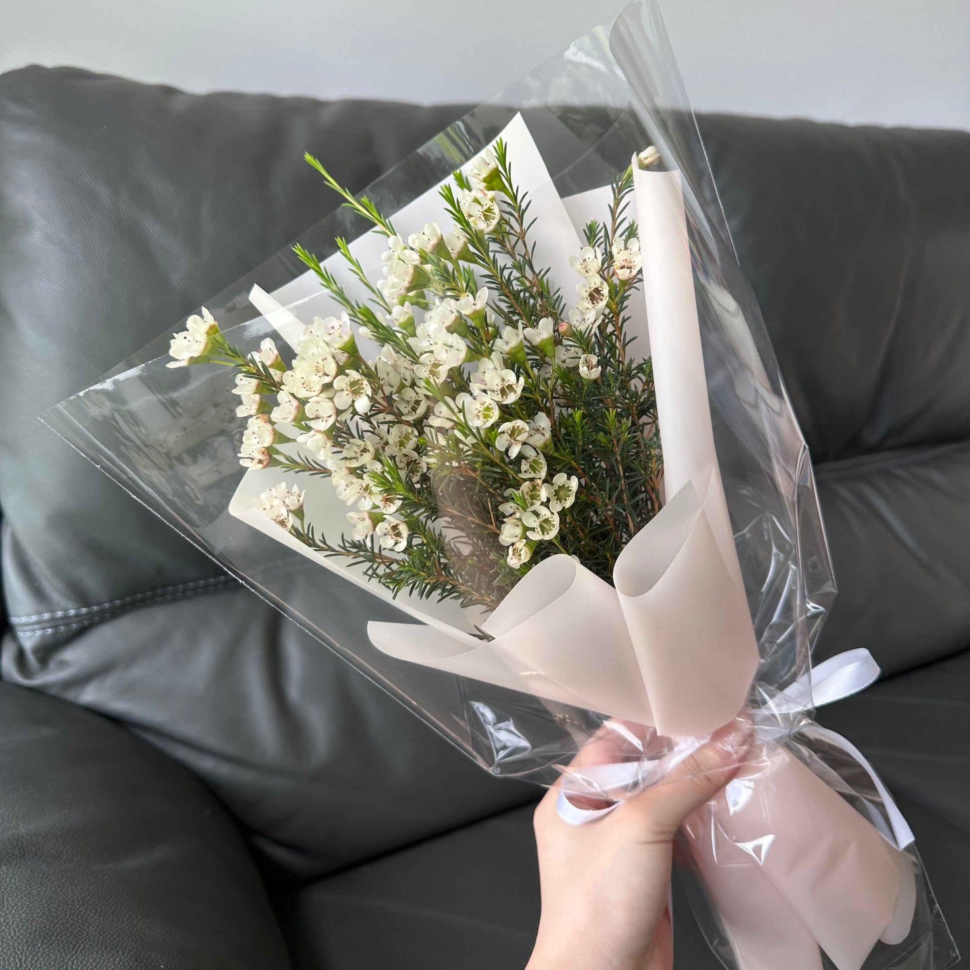 A bouquet of delicate Chamelaucium (wax flowers), symbolising endurance and lasting beauty. Their tiny blossoms and lush greenery create a whimsical, natural feel, wrapped in soft light pink for a touch of sweetness and elegance. Perfect for adding a subtle, romantic charm to any occasion.