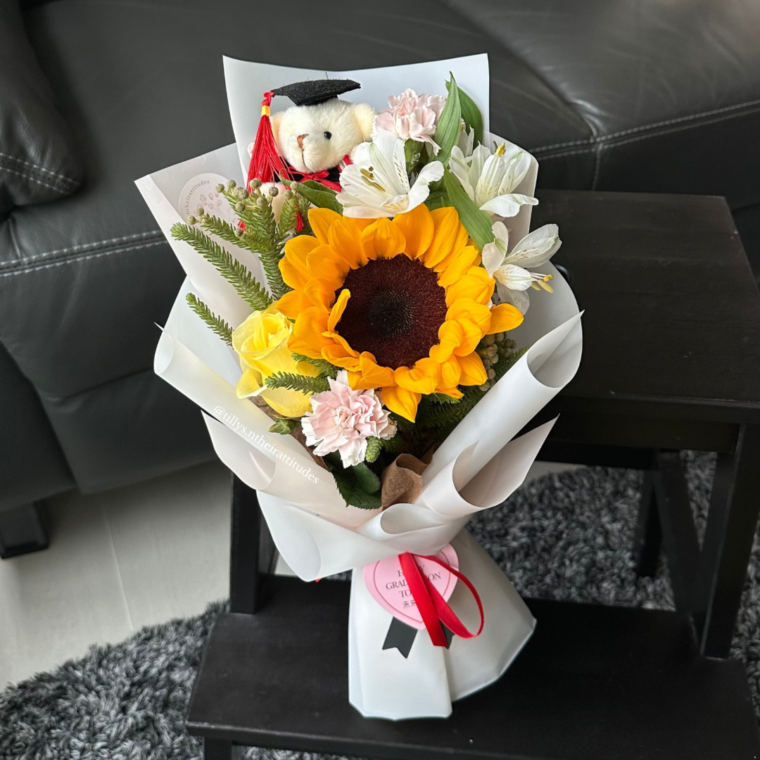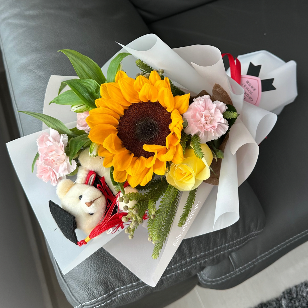 Celebrate a proud moment with this joyful bouquet featuring a single vibrant Sunflower 🌻, paired with a cheerful yellow Rose 🌼, delicate side blooms, and an adorable Graduation Bear 🎓. A perfect token of sunshine, success, and new adventures ahead!