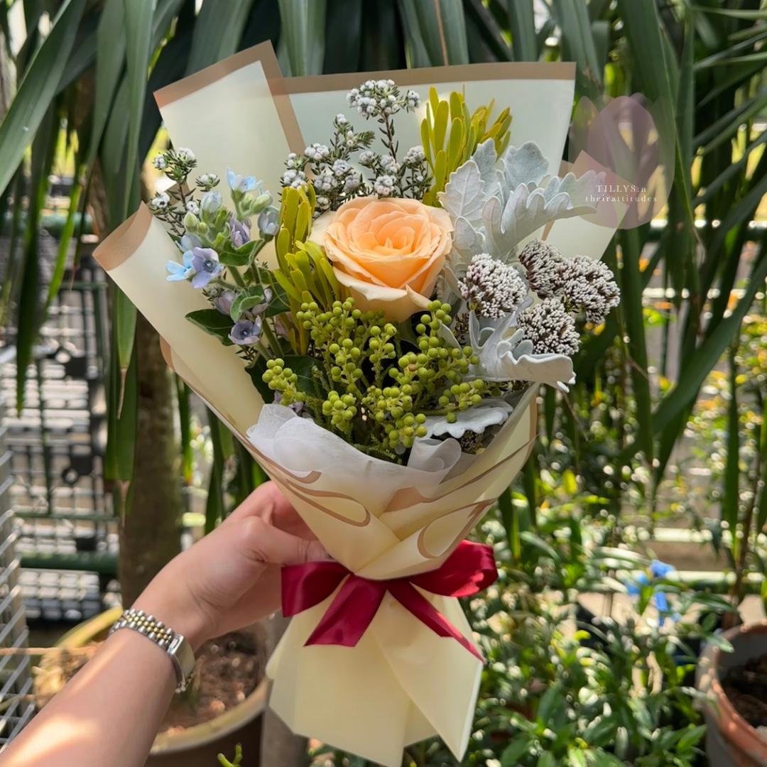 A single champagne Rose takes center stage in this elegant bouquet, paired with delicate Tweedia, silvery foliage, and lush South African greens. Wrapped in sunny yellow, the arrangement exudes warmth, sophistication, and natural beauty — perfect for sending a thoughtful gesture or brightening someone’s day with understated charm.